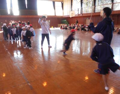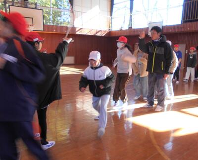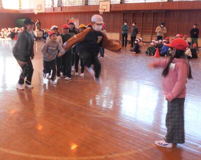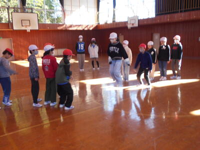 昼休みには、学年対抗で長縄大会(8の字跳び)を行いました。5分間で跳んだ回数を競います。学年に応じたハンディキャップがつきます。子供たちは、これまで業間の体力づくりタイムや体育の授業で、それぞれの学年ごとに練習を重ねてきました。どの学年の子もいい記録を出そうと一生けんめい縄を回したり、跳んだり、声を掛け合ったりしました。