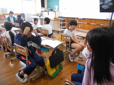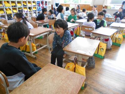 後期から朝の会の時間に「トークタイム」を取り入れています。自分の考えを伝えたり、友達の意見を聞いたりすることで、「話す・聞く」力を伸ばすことや社会生活を円滑に送るために必要なコミュニケーション能力や対人関係のスキルを伸ばすことを目的として行います。今日は1年生は「好きな食べ物」、2年生は「好きなお菓子」、3年生は「秋の食べ物」というテーマで、おとなりの友達と話し合っていました。