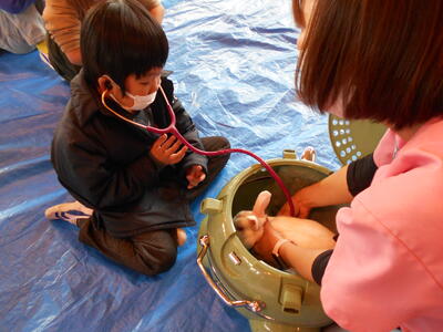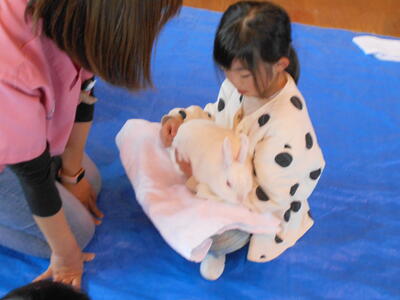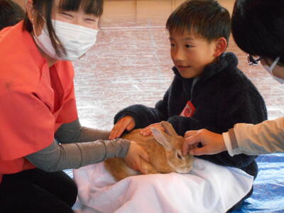 1年生は獣医師さんに来ていただき、「ウサギとのふれあい学習」を行いました。初めてウサギを抱っこする子は最初は緊張している様子でしたが、徐々に慣れ、「もっと抱っこしたい」と言うほどでした。また、「かわいい」「あたたかい」などの感想を話していました。ウサギを抱っこしたり、ウサギの心音を聴診器で聞いたりして、ウサギが生きていることを感じながら活動をしました。これからも生き物を大切にしていきましょうね。
