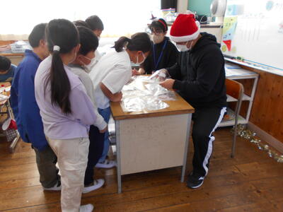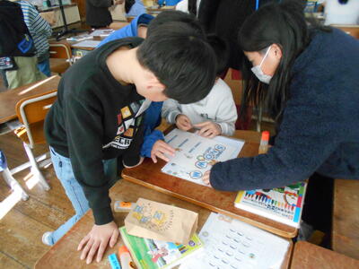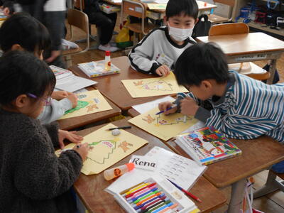 2年生は英語活動で季節の行事とカード作りに取り組んでいました。「I like ~.」や「~please.」などの英語表現を使って外国の文化を楽しく取り組んでいました。