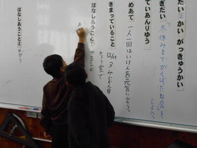 2年生は学級活動で「冬休みまでがんばったね会をしよう」の話合い活動をしていました。今回はどんな内容にするか、どんな係が必要かなどについて話し合いました。自分の考えを伝え合いながら、みんなで話合い、みんなが納得するように合意形成を図っていきました。意欲的に発言する子が多くてすばらしいと思いました。自分たちで考え行う「がんばったね会」はきっと楽しい会になることでしょう。