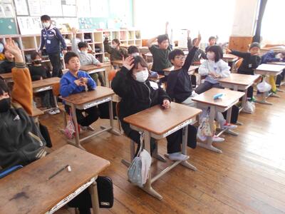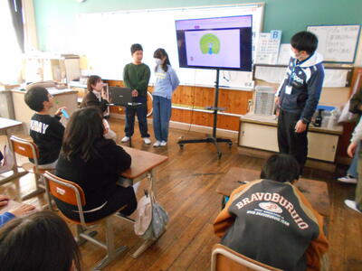 須賀川小→両郷中央小→川西小→黒羽小の順で進みました。他校から出されるクイズに答える中で「It's~」と基本的な英会話を使って答えることができていました。正解すると大喜びです。また黒羽小からクイズを出すときにも「What's this?」や「Hint1」、「That's right !」、「No sorry.」などの英語を使って楽しむことができました。クイズを通して、他校の友達と外国語の学習をしたり、交流を深めたりすることができました。