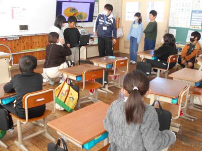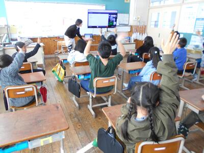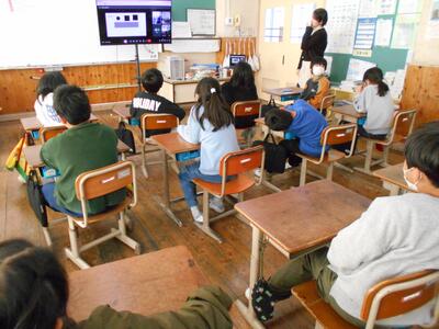 3年生は外国語活動で3ヒントクイズをつくりました。今日は黒羽地区4小学校の3年生で英語を使ってクイズを出し合うリモート交流を行いました。授業前にリモートがつながり、各学校の映像が映ると「〇〇さんだ」、「野球で一緒の人だ」など相手を確認し、和やかな雰囲気でした。