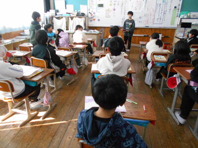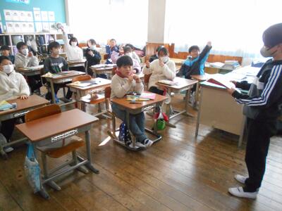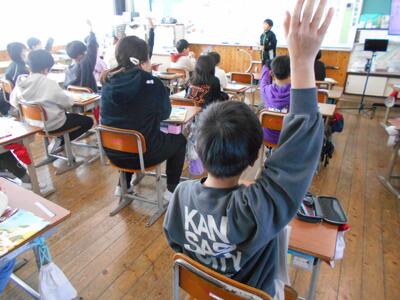 4年生は国語の時間に、テーマを決めその言葉から連想を広げて詩を書き、それを読み合う学習をしました。例えば「バナナ」から「黄色」、「すべる」、「ゴリラ」、「おいしい」を連想し、さらに「黄色」から「キリン」を連想していくというように言葉を広げていきます。そして、それらをもとに一言で詩を書く言語活動に取り組みました。授業の最後には書いた詩を読み合い、テーマは何なのかをクイズ形式で当てる学習をしていました。子供たちは発想や思いを大切にしながらいろいろな言葉を連想し、楽しそうに学習に取り組んでいました。