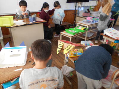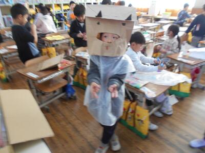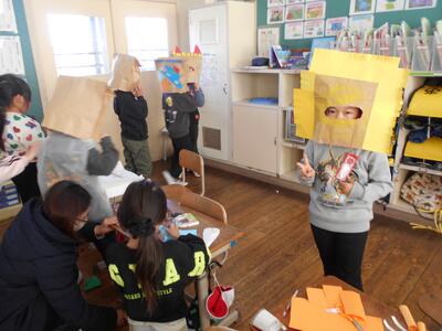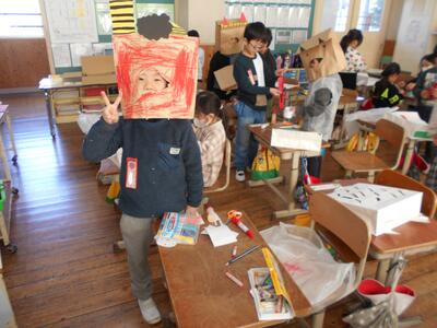 1年生は図工の時間に「かぶって、へんしん」という学習で、紙袋やビニル袋を使って、鬼やウサギ、ライオンなどに変身するために造形遊びをしていました。みんな思い思いのかぶり物になるよう、色や形、穴の開け方、紙の貼り方など工夫しながら取り組んでいました。2/3の節分にはみんなでかぶって、変身して、パレードをするそうです。楽しみですね。