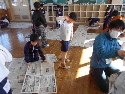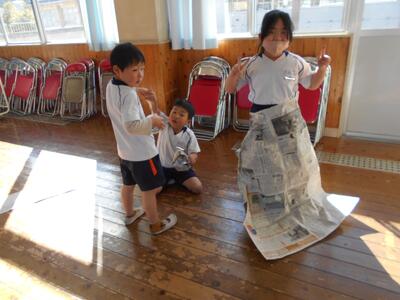 1年生は図工の時間に新聞紙を使って造形遊びを楽しんでいました。新聞紙の肌触りを感じたり、丸めたり広げたりして発想を広げ楽しく表現したりしていました。子供たちの想像力ってすごいなと改めて感じました。