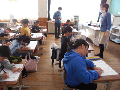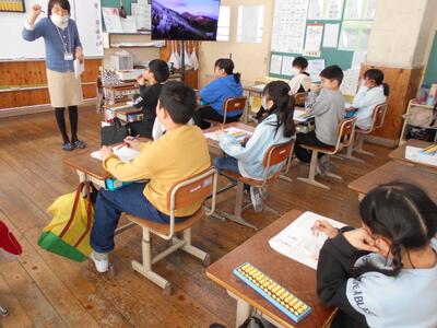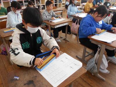 3年生は外部講師の方に来ていただきそろばん教室を行いました。まずは、そろばんの各部分の名前を教えていただき、次に、一玉と五玉、位などについての説明を聞きました。その後、一の位の足し算や引き算を学習しました。みんなはじめてのそろばんを使っての計算でしたが、講師の方の教え方がお上手だったので、みんな楽しみながら学習し、「ごめいさん」と声を上げていました。外部講師の方、ありがとうございました(*^o^*)!。