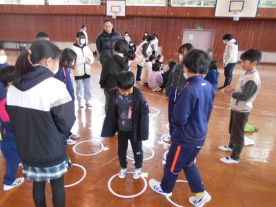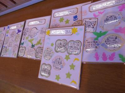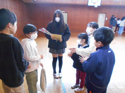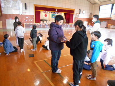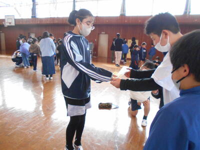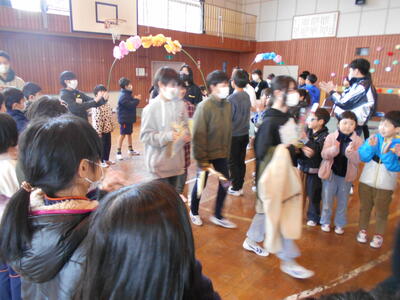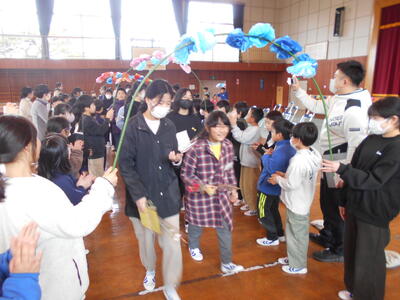 最後に、1~5年生が書いた寄せ書きの色紙とお花のプレゼントしました。また、一人ずつ感謝や励ましの言葉を掛け合いました。
