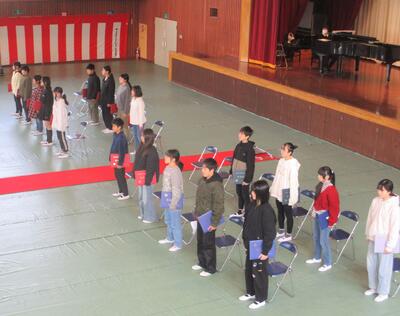 今日は、来週19日木曜日に行われる「卒業式」に向けての予行練習を行いました。入場から退場まで、当日の式の流れに沿って練習しました。6年生はさすが、歩き方や礼の仕方などもしっかりしていました。卒業証書を受け取るときも、校長の目をしっかりと見て、受け取りました。また、1~5年生も話の聞き方や別れのことば、歌などもしっかり行っていました。全校生と職員とで予行練習を行うことで、細かな修正点も見つかり、よりよい幸せな卒業式とするため、再度行うところもありました。19日の卒業式に向け、これからも全員で気持ちを一つに準備を進めていきます。