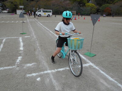 3時間目には、3年生の自転車教室を行いました。3年生になると活動範囲も増え、自転車に乗る機会も増えてきます。自転車に乗るときのルールや安全な乗り方についてお話を聞き、模擬道路や簡易コースを使って、安全な乗り方の練習をしました。