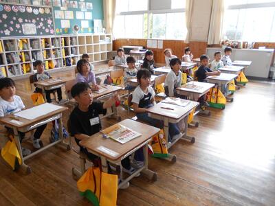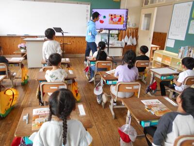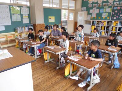 1年生は算数の学習をしていました。教科書の挿絵を見て、色紙の枚数や机の脚の数などを数えたり、形の学習をしたりしました。これからの勉強が楽しみですね。